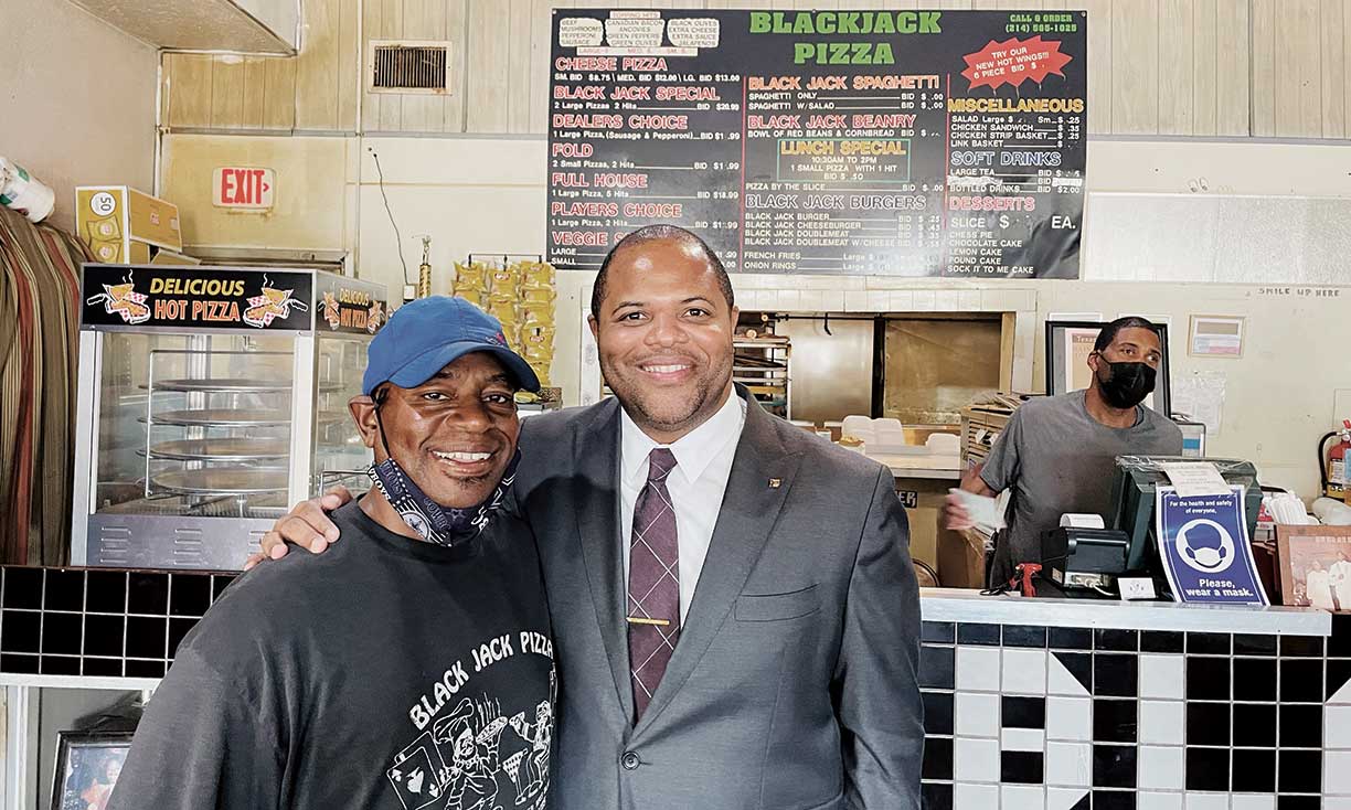 “Heyyyy, Eric!” the man behind the counter at Black Jack Pizza in south Dallas shouts when the mayor walks in for lunch. Seeing a reporter in tow, he quickly corrects himself.