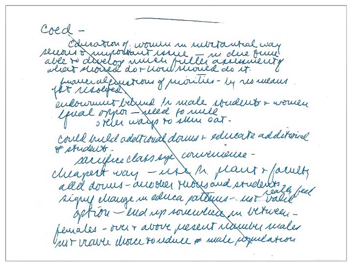 Fortunately, my handwriting then was better than it is now, so my notes from that interview are legible, or at least decipherable. They show that he began by saying that the education of women in a substantial way was a serious and important issue. And then he said “it is inevitable that, at some point in the future, Princeton is going to move into the education of women.” The only questions, he said, were those of strategy, priority, and timing.