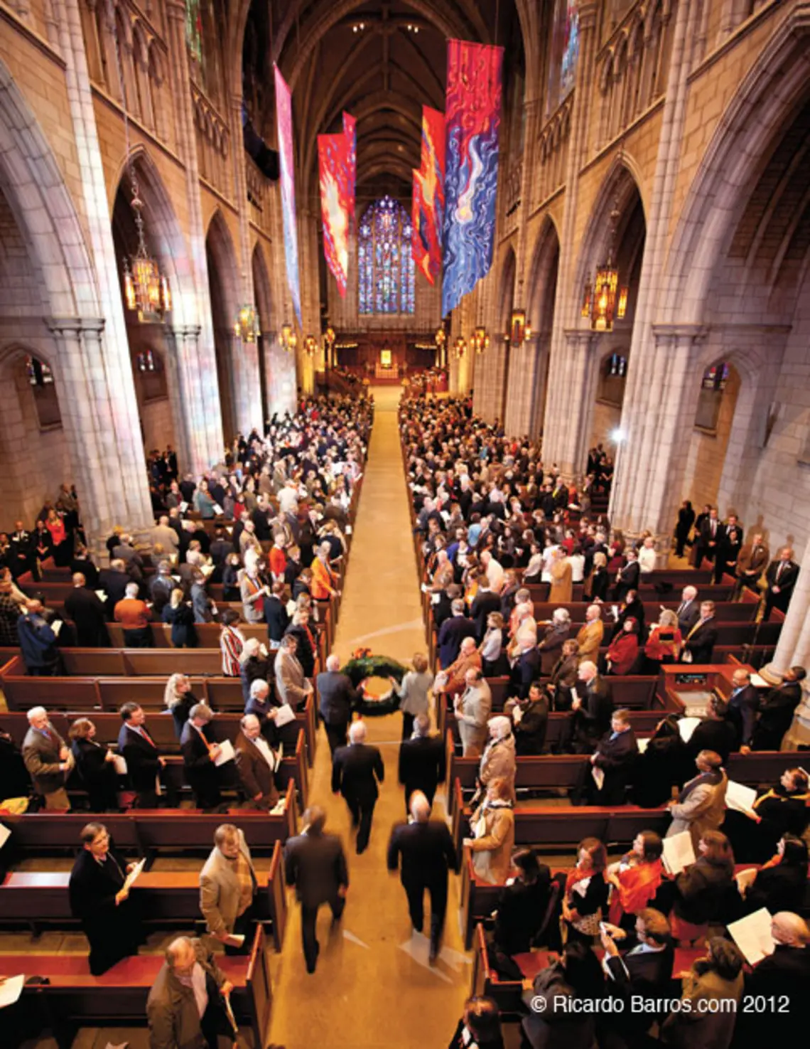 Service of Remembrance Carrying a wreath made of ivy leaves from across campus, Anne Sherrerd *87 and Henry Von Kohorn ’66 lead the memorial procession in the Chapel on Alumni Day.