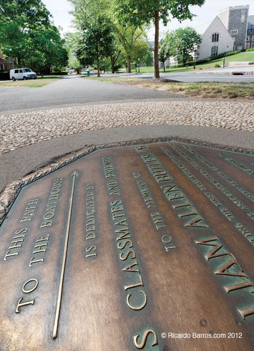 Along Elm Drive Embedded in the sidewalk near Patton Hall, a bronze plaque in memory of William Allen Butler 1876, founder of the Princeton University Rowing Association, points the path to the boathouse.