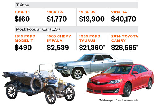 A hundred years ago, Princeton’s tuition was $160, while buying the country’s most popular car, the Model T, would set you back three times that. Today a top-selling car goes for two-thirds of a year’s tuition. Compiled by Jennifer Shyue ’17