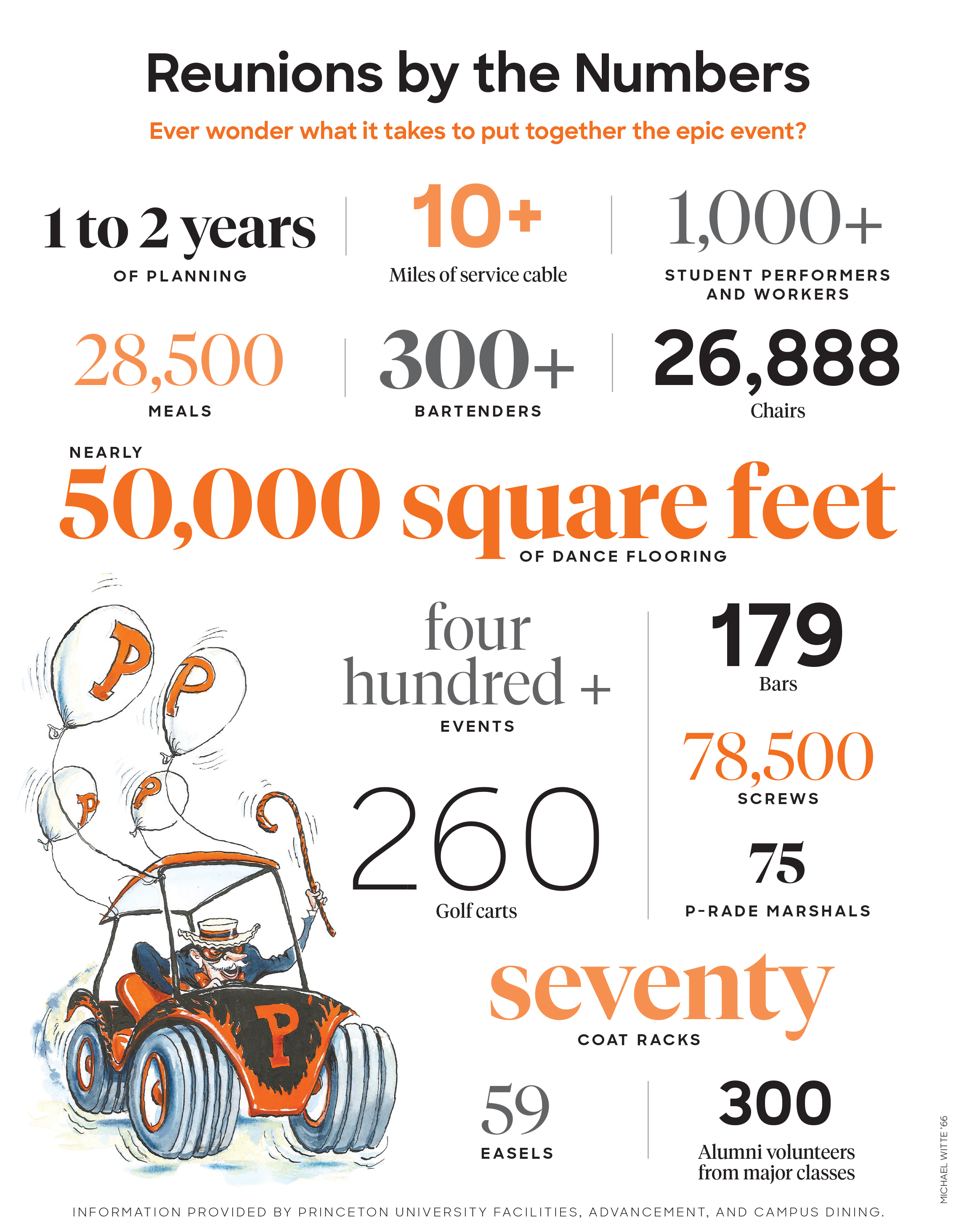 Alumni NewsGet to Know Princeton Reunions By the Numbers Published May 17, 2023 No responses yetJoin the conversation Name Email Princeton affiliation - Select -AlumniFacultyStaffStudentCommunity MemberNon-alumni ResponsePlain textFull name and Princeton affiliation (if applicable) are required for all published comments. For more information, view our commenting policy. Responses are limited to 500 words for online and 250 words for print consideration. The Latest See all AdministrationEisgruber Letter Warns University Community of Additional Budget Cuts Latest NewsA Princeton Neuroscience Professor Is Running For Congress President’s PageThe Humanities at Princeton: Our Future Is Bright News + FeaturesTo Be ‘Welcoming,’ Town of Princeton Adds Housing Lives Lived & LostDavid Feinman *62 Lived for Service, Travel, and Adventure Related News AdministrationEisgruber Letter Warns University Community of Additional Budget Cuts Latest NewsA Princeton Neuroscience Professor Is Running For CongressProfessor Samuel S. Wang, a longtime election reform advocate, is among the Democratic primary candidates for New Jersey’s 12th District President’s PageThe Humanities at Princeton: Our Future Is Bright 1 Response