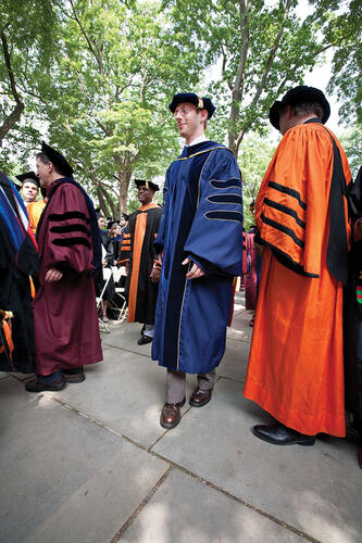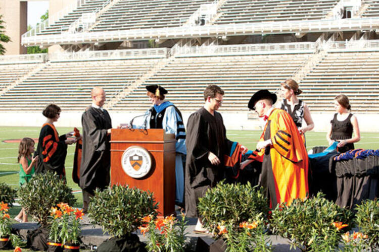 Commencement caps three days of graduation celebrations, including Baccalaureate and Class Day (see page 56). Graduate students get ready for the big event in a hooding ceremony, where they receive their colorful doctoral and master’s-degree hoods. Princeton held its first hooding ceremony in 1994 in Procter Hall in an effort to “recognize students individually,” says David Redman, associate dean for academic affairs at the graduate school. The ceremony, which already had outgrown Richardson Auditorium and then McCarter Theatre, this year moved to Princeton Stadium, and some 2,000 guests attended.