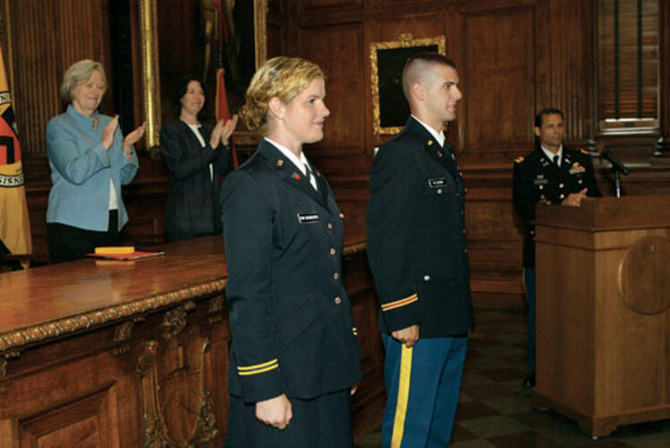 Each year after Commencement, some graduates receive commissions as U.S. Army officers. This year, there were two: Amanda Van Duynhoven ’11 and Nathan Plough ’11, above, now second lieutenants — Plough in the Army’s Ordnance Corps, and Van Duynhoven in the Adjutant General Corps. After the ceremony in Nassau Hall’s Faculty Room, the new officers handed shiny silver dollars to the first enlisted soldiers who saluted them, in a tradition called the “Silver Dollar Salute.” Upon completion of their training, Plough will be stationed at Fort Richardson, Alaska, and Van Duynhoven at Fort Eustis, Va.