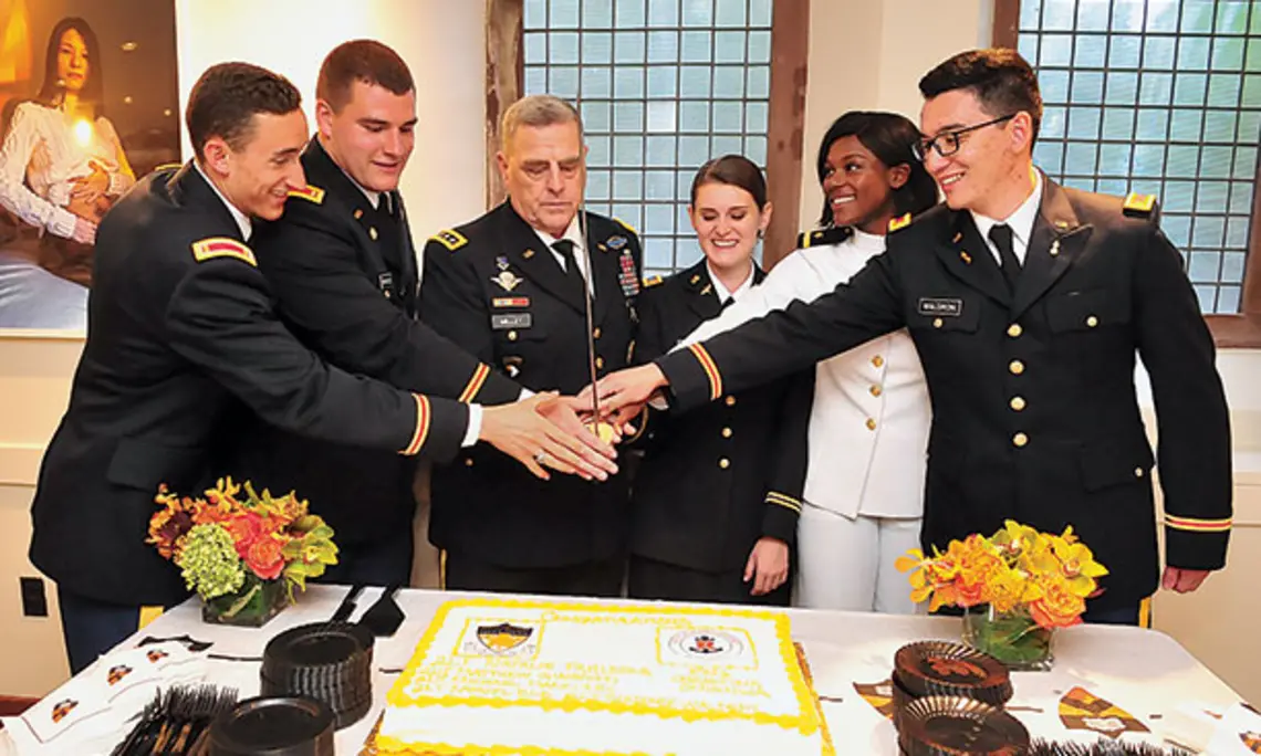 Gen. Mark Milley ’80, chief of staff of the Army, joins in the celebration of graduating seniors after addressing the joint commissioning ceremony of the Army and Naval ROTC programs June 5. From left are 2nd Lts. Samuel Rob and Michael Markulec, Milley, 2nd Lt. Natalie Fahlberg, Ensign Christina Onianwa, and 2nd Lt. Theodore Waldron. Not shown is 2nd Lt. Matthew Giannotti. Onianwa is the first student to participate all four years in Naval ROTC since it was reinstated in 2014.