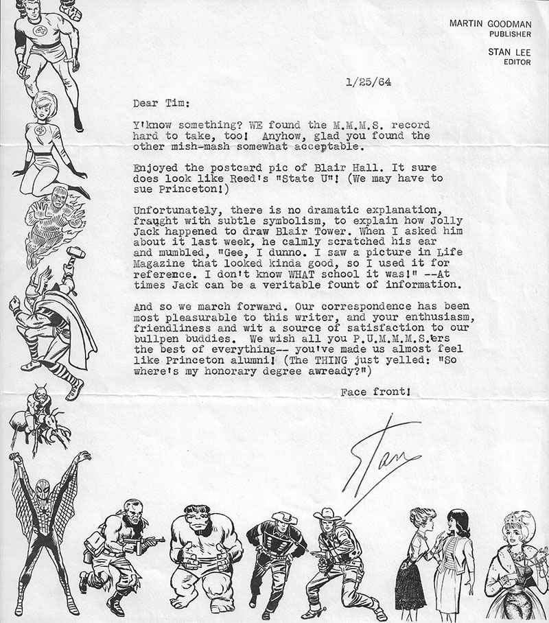 Like many undergrads in the mid-’60s, the Tulenkos grew up reading the formulaic hero comics of the ’50s. Marvel titles were known for “gently mocking the formula” set in place by Superman and his D.C. counterparts, Tim Tulenko said. Lee, the face of the Marvel franchise and creator of Spider-Man and scores of other beloved characters, was an admired figure on campus. A handful of Princetonians formed their own “chapter” of the Marvel fan club, the Merry Marvel Marching Society, and Tim, emboldened by this quasi-official status, stopped by Lee’s office in New York to ask about Blair Hall’s Fantastic Four cameo.