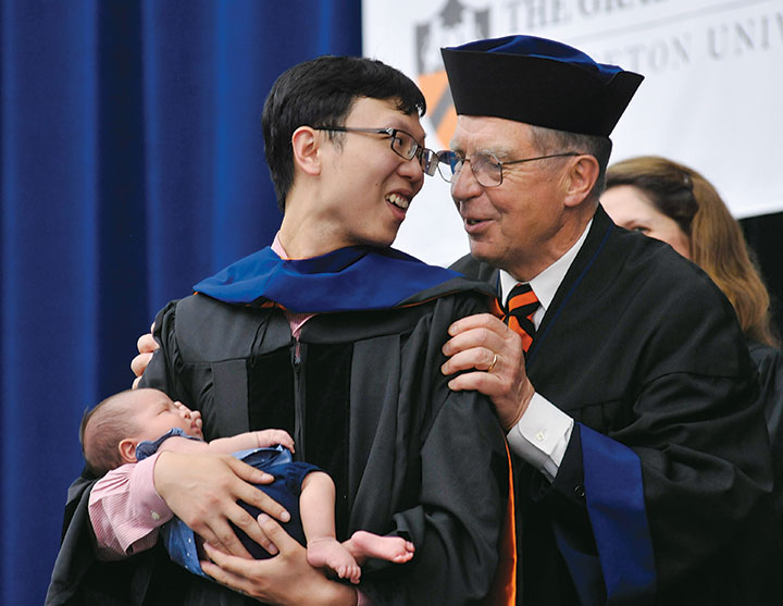 Liechao Huang *16 holds his 5-week-old daughter, Mu, after receiving his academic hood from one of his Ph.D. advisers, Sigurd Wagner, professor emeritus of electrical engineering, during the Graduate School’s hooding ceremony May 30 in Jadwin Gym. Also receiving her hood was Huang’s wife, Jin Cheng *16, for her doctorate in chemistry. During the ceremony, President Eisgruber ’83 said that “Princeton’s graduate alumni continue to play leadership roles in academia, America, and the world.”