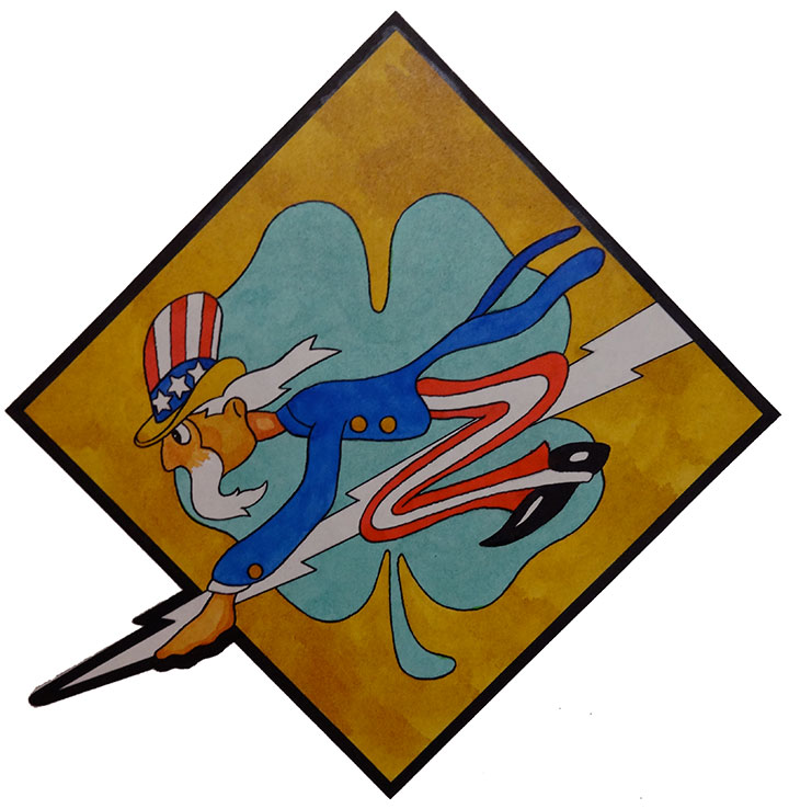 In Satan’s Angels, other squadrons emblazoned their planes with pictures of frowning devils. For his own 432nd Squadron, Toll drew a light-hearted coat-of-arms: Uncle Sam riding a lightning bolt (for the P-38 Lightning), superimposed on a green four-leaf clover (the squadron’s radio call sign was Clover), all framed within a yellow diamond (to match Clover Squadron’s yellow propeller-spinners).