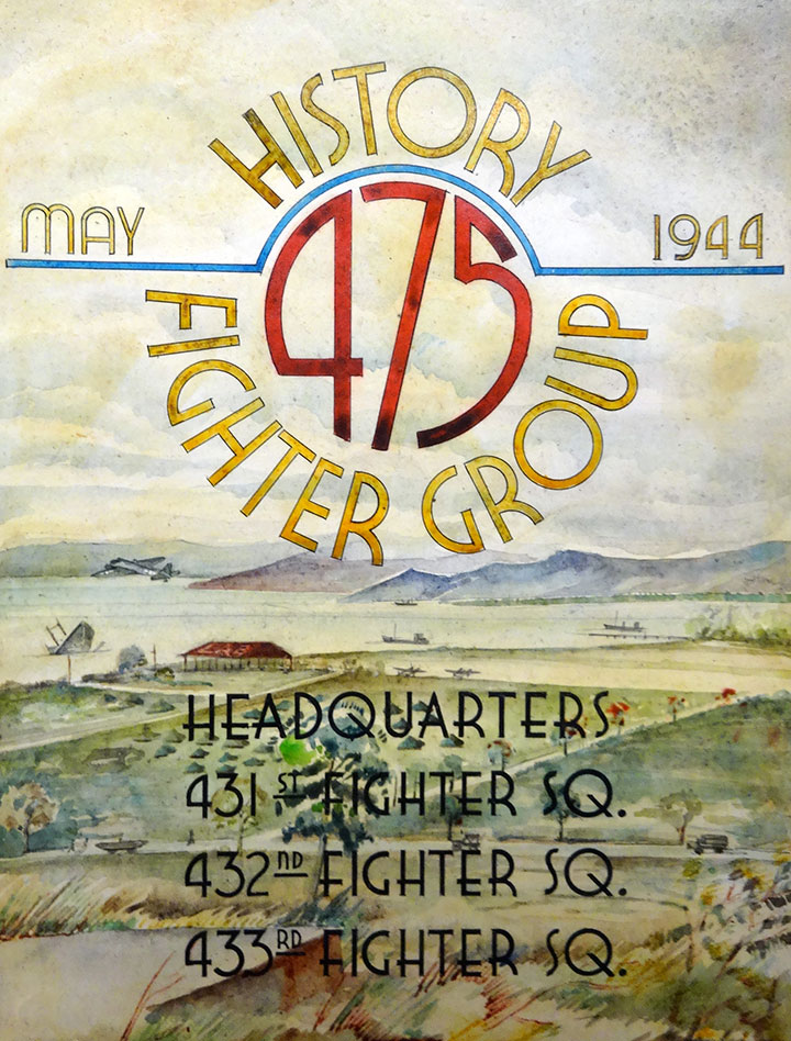 For the March 1944 group history cover, Toll painted an homage to Mondrian – a study in geometric shapes and bold primary colors, with slim art deco lettering. It was an artist’s joke to paint like Mondrian in New Guinea, amid war, heat, rain, mud, and mosquitoes. It was a pilot’s joke to use a red circle for the 431st Fighter Squadron, a yellow diamond for the 432nd Fighter Squadron, and a blue square for the 433rd Squadron – these were the colors with which these squadrons trimmed their warplanes.