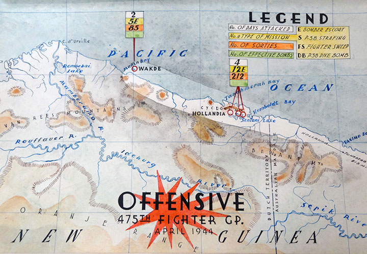 World War II records are mostly monochrome – reams of typescript, dense block paragraphs, and black-and-white photos. But in the archives of the Fifth Air Force, which fought in New Guinea and the Philippines, deep in a stack of reports for the 475th Fighter Group, there is a bright, unexpected swathe of color.