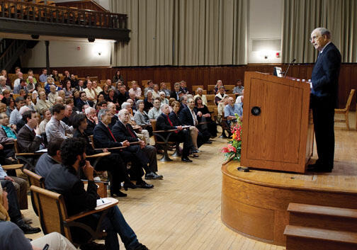 Opening the Woodrow Wilson School’s two-day colloquium on “Challenges to U.S. Policy in the Middle East” May 3, former Sen. George Mitchell, the former U.S. special envoy for Middle East peace, explained why Israel and the Palestinian Authority each need an agreement for a two-state solution – and soon. Israel faces growing risks from political isolation and simple demography, and from rockets that fly farther and more accurately; Palestinians live under occupation and watch as offers for a state continue to worsen, “as they have for the last 60 years,” he said. “The political pain leaders [on both sides] will have to endure to get an agreement is far less than the pain their people will endure if they don’t get an agreement,” he said. Almost 200 graduate alumni and guests returned for the conference, which featured panels and lectures on Iran, Syria, and the Arab Spring. Ryan Crocker *85, a career ambassador with the U.S. Foreign Service, cautioned against a shift toward “neo-isolationism” in a keynote talk. “Disengagement can have consequences as great and grave as getting in,” he said.