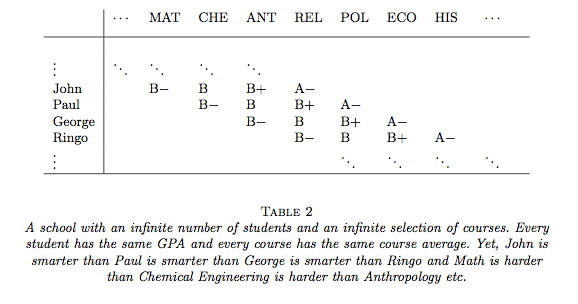 Consider for example, a school with only four students, John, Paul, George, and Ringo. Suppose further that this school only offers six different courses from which the students select four to take. The students made their selections, took the courses, and we now have grading information as shown in Table 1. From this table, we see that George and Paul have received the same grades (in different courses) and so their grade-point averages, i.e. their GPA’s, are the same. Furthermore, John’s grades are only slightly better and Ringo’s grades only slightly worse than average. But, it is also clear that the Math class gave lower grades than the Economics course. In fact, there is a linear progression in grade-inflation as one progresses from left to right across the table. Taking this into account, it would seem that John took “harder” courses than Paul (the quotes are to emphasize that a course that gives lower grades is not necessarily more difficult even though we shall use such language throughout this paper), who took harder courses than George, who took harder courses than Ringo. Hence, GPA does not tell the whole story. John did the best in all of his courses, in many cases by a wide margin. Ringo, on the other hand, did the worst in all of his classes, again by a wide margin. It is clear that John is a much better student than Ringo. Better to a degree that is not reflected in their GPA’s.