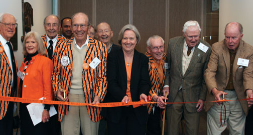 President Tilghman joined Bob Young, president of the Class of ’42 (shown left of Tilghman, with glasses and sweater), and other class members and friends during ceremonies Oct. 3 at Butler College to recognize the classes of 1922, 1940, 1941, and 1942. Butler College’s new dorms were built on the site of razed dorms named for Donold B. Lourie and George H. Love, both ’22, and for the classes of 1940, 1941, and 1942. The new dorms include a memorial court with class stones and time capsules beneath them. The Class of ’42 lounge, which overlooks the court, has alcoves with plaques and memorabilia honoring the classes of 1940, 1941, and 1942. A walkway through the center of the college was dedicated as Lourie-Love Walk.