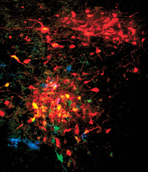 Genetically engineered viruses leave colorful tracks as they travel through a rat’s brain and help map the degree of connection in neurons involved in blood-pressure regulation. The image was created by molecular biology professor Lynn Enquist and J. Patrick Card, a professor at the University of Pittsburgh.
