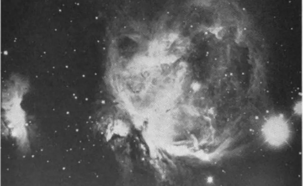 Our present earth-bound telescopes do not have nearly enough power to see in detail how stars are being formed in these gaseous nebulae. A telescope above the atmosphere would be an ideal tool for studying the structure of these clouds. For example, a 40-inch telescope on a satellite could photograph a nebula clearly with ten times the magnification practical with the existing 200-inch. If so great a magnification is attempted with the 200-inch, on the earth’s surface, the picture is blurred because of motions in the air above the telescope. In the almost perfect vacuum between the stars light travels in straight lines, and enormous magnifications are possible with a telescope of sufficient size.