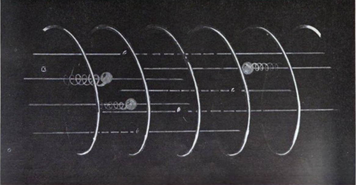 At a temperature of one hundred million degrees, every known material would instantly vaporize. Somehow, we must produce a non-material container. Let us now recall another basic principle. In a uniform magnetic field, a charged particle moves freely along the field, but moves in a circular path in the plane perpendicular to the field. If we imagine lines which lie in the direction of a magnetic field, called lines of force, we can conveniently think of charged particles moving in a helical or “corkscrew” path about a magnetic field line as if they were “stuck” to the line. The frequency of rotation about the field line is called the cyclotron frequency. Figure 2 is intended to illustrate the motion of particles in a uniform magnetic field. The coil shown in Fig. 2, which is called a solenoid, can produce a uniform magnetic field.