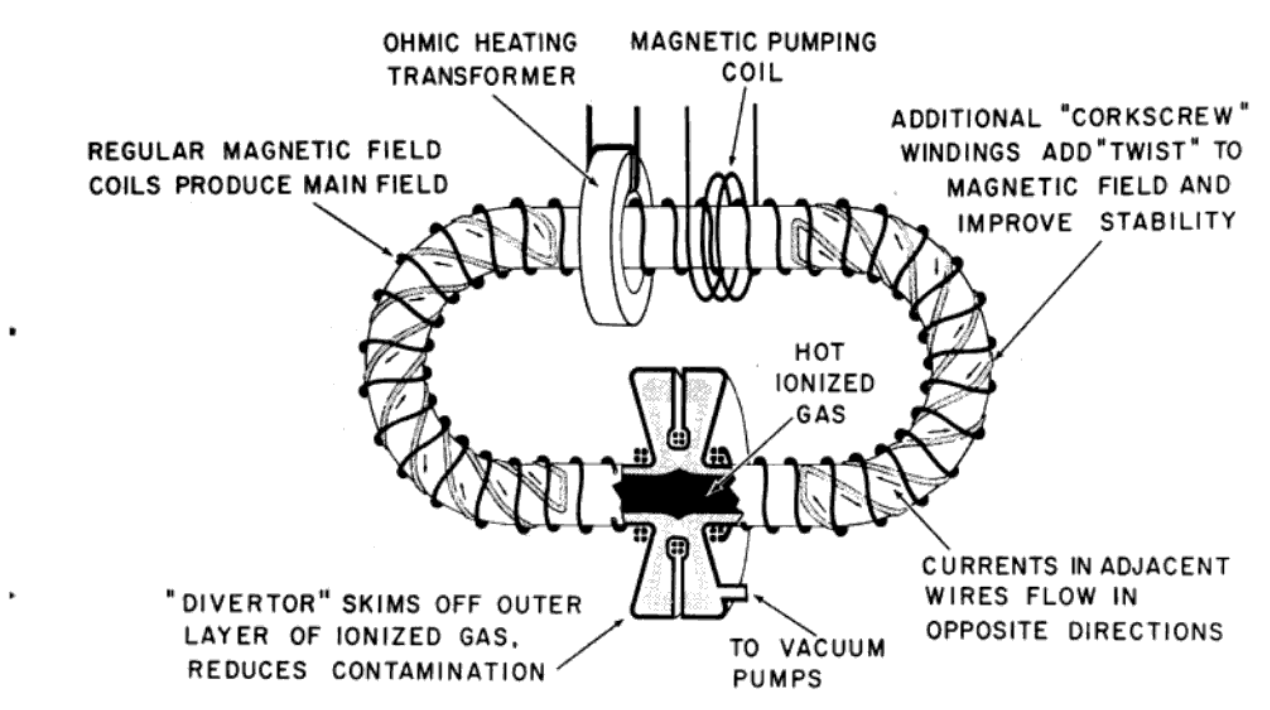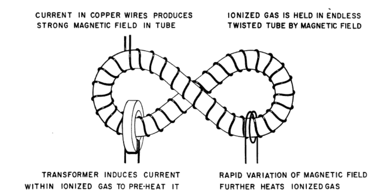 After reading a news report in 1951, which subsequently proved to be false, that one Ronald Richter, working in Peron’s Argentina, had reached the threshold of a controlled thermonuclear reaction. Lyman Spitzer began to think about how this feat might be achieved. The culmination of this activity of Professor Spitzer was the Stellarator. The Stellarator is a device which, in theory, can satisfy the condition which we have set forth for a controlled thermonuclear reactor. We shall now see how the Stellarator meets the requirements of confining and heating a plasma.
