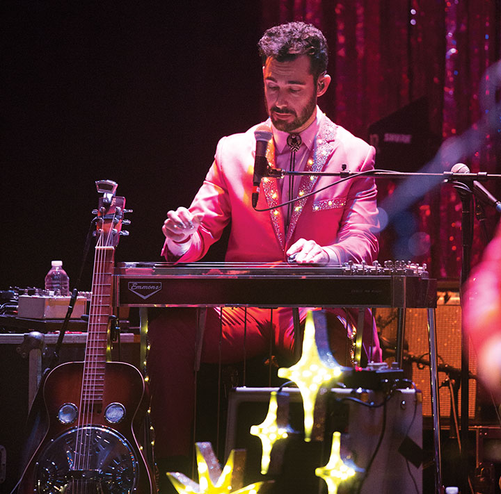 Adam Ollendorff ’00 plays pedal steel guitar, which is positioned on legs because it requires a steel slide and foot pedals. The most rewarding part of playing music professionally, he says, is “becoming friends with many of my musical heroes.” He’s seen here performing on tour with country singer Kacey Musgraves at the Apollo Theater in New York City in October.