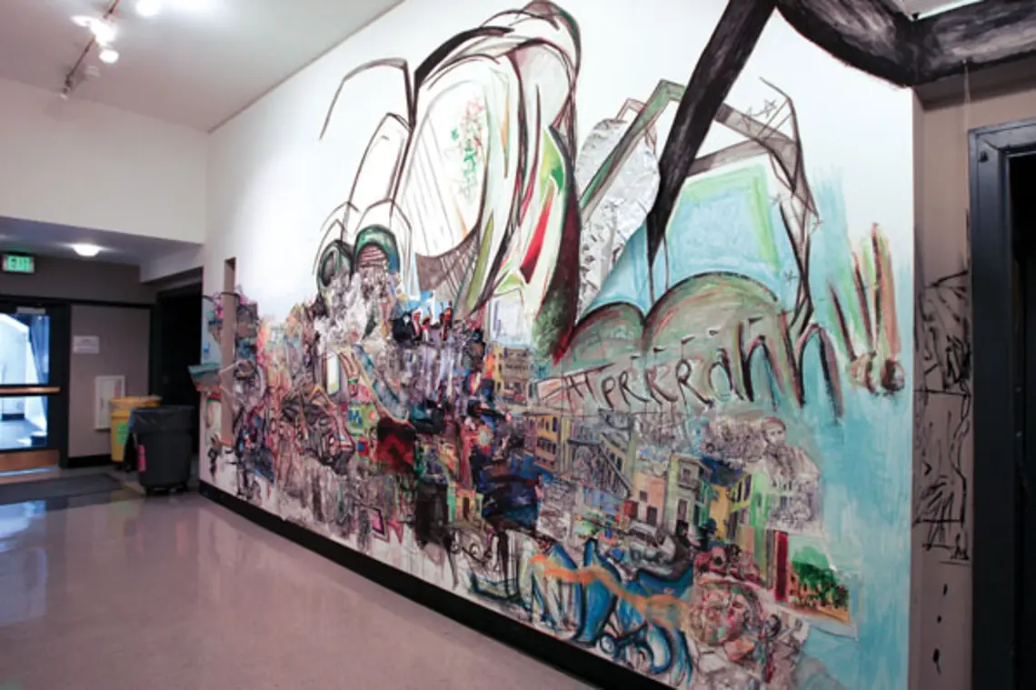 Part of Meredith Thompson ’08’s senior thesis — an installation on view in April and May at the Lewis Center for the Arts, above with inset detail at left — reflected the time she spent as a teacher and artist in Puerto Rico, where she drew cityscapes and landscapes in Old San Juan. With reggaeton music — hip-hop-influenced Spanish music — playing in the background, and a collage of her paintings and drawings on the wall, her exhibit, says Thompson, who majored in visual arts, reflected what she sees as the negative influences of the United States on Puerto Rican culture.