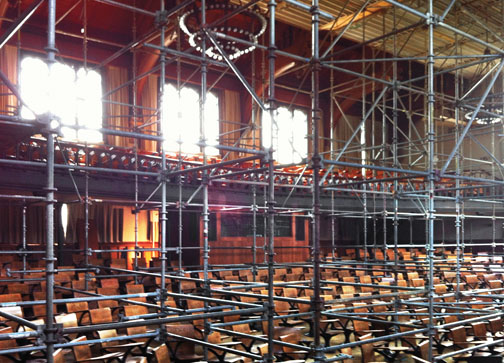 The lecture hall, the most popular event space on campus besides Richardson Auditorium, was closed for the summer to undergo renovation. Extensive scaffolding was installed so workers could replace the speaker cluster high up in the ceiling, and at the same time update the smoke alarms and fire-sensor system. The scaffolding was removed just in time for the start of fall classes.