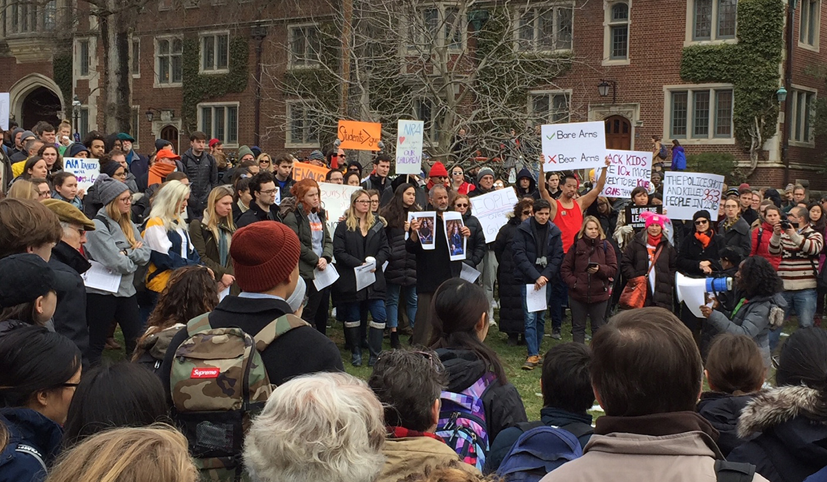 More than 400 students, faculty, and community members gathered in front of Frist Campus Center March 14 to rally against gun violence and advocate for stronger gun laws on a day of nationwide school walkouts and protests. Protesters held up signs, offered personal stories, and registered to vote.