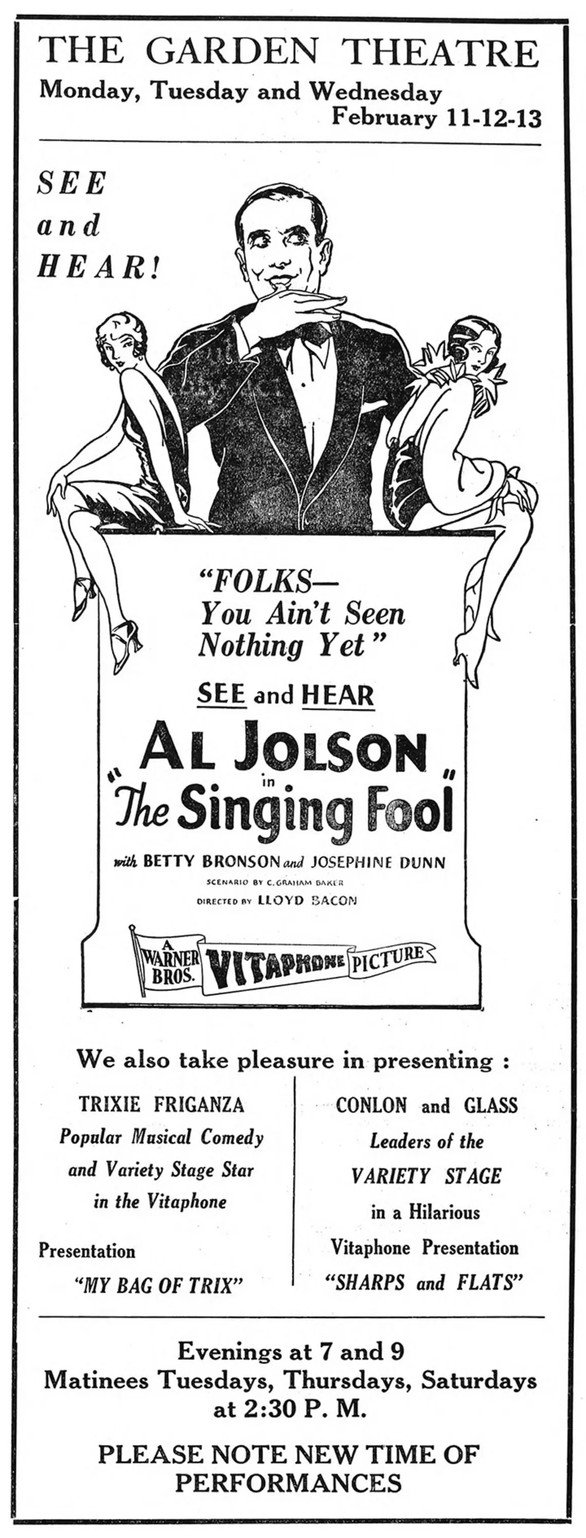 Undeterred, the Garden Theatre announced its first talkie in the Prince Feb. 11, urging readers to “See and Hear” The Singing Fool, a “Warner Bros. Vitaphone Picture” released in 1928. Like The Jazz Singer, it starred Al Jolson, the most celebrated entertainer of his day, and it proved to be an even greater hit, movingThe Film Daily to declare, “Here is complete vindication for the advocates of sound pictures.” In paraphrasing Jolson’s signature line in its advertisement, “Folks — You Ain’t Seen Nothing Yet,” the Garden Theatre was prescient: Talkies were here to stay.
