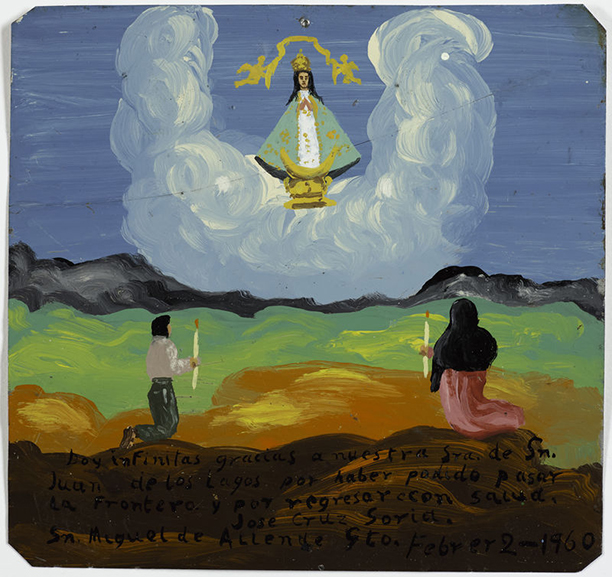 The exhibition includes more than 50 Mexican retablos — folk paintings dedicated to Christ, the Virgin Mary, or saints to commemorate a miraculous event. The small-scale paintings on metal span the 20th century and contain themes such as suffering, insecurity, and salvation, particularly in regard to the challenges of crossing the U.S.-Mexico border. Pictured is the Retablo of José Cruz Soria, 1960.