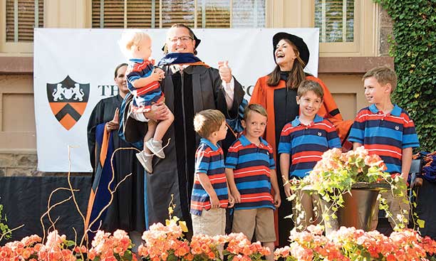 Rob Harrison *19 is accompanied by his five sons — Quinn, Sean, Patrick, Connor, and R.J. — as he receives his hood for his Ph.D. in computer science, with Chief Marshal Sandra Bermann looking on. “Your hood signifies the knowledge you have gained and the skills you have developed, as well as the fact that you have contributed something genuinely new to an existing body of knowledge,” Graduate School Dean Sarah-Jane Leslie *07 told the advanced-degree recipients who took part in the hooding ceremony on Cannon Green. Harrison, an Army lieutenant colonel, is an assistant professor at West Point.