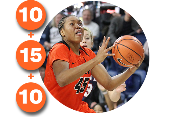 10 points + 15 rebounds + 10 assists for Leslie Robinson ’18 — Robinson recorded Princeton’s first triple-double against Brown March 2 in a 79-44 win that clinched at least a share of the Ivy championship — and she was only in the game for 26 minutes.