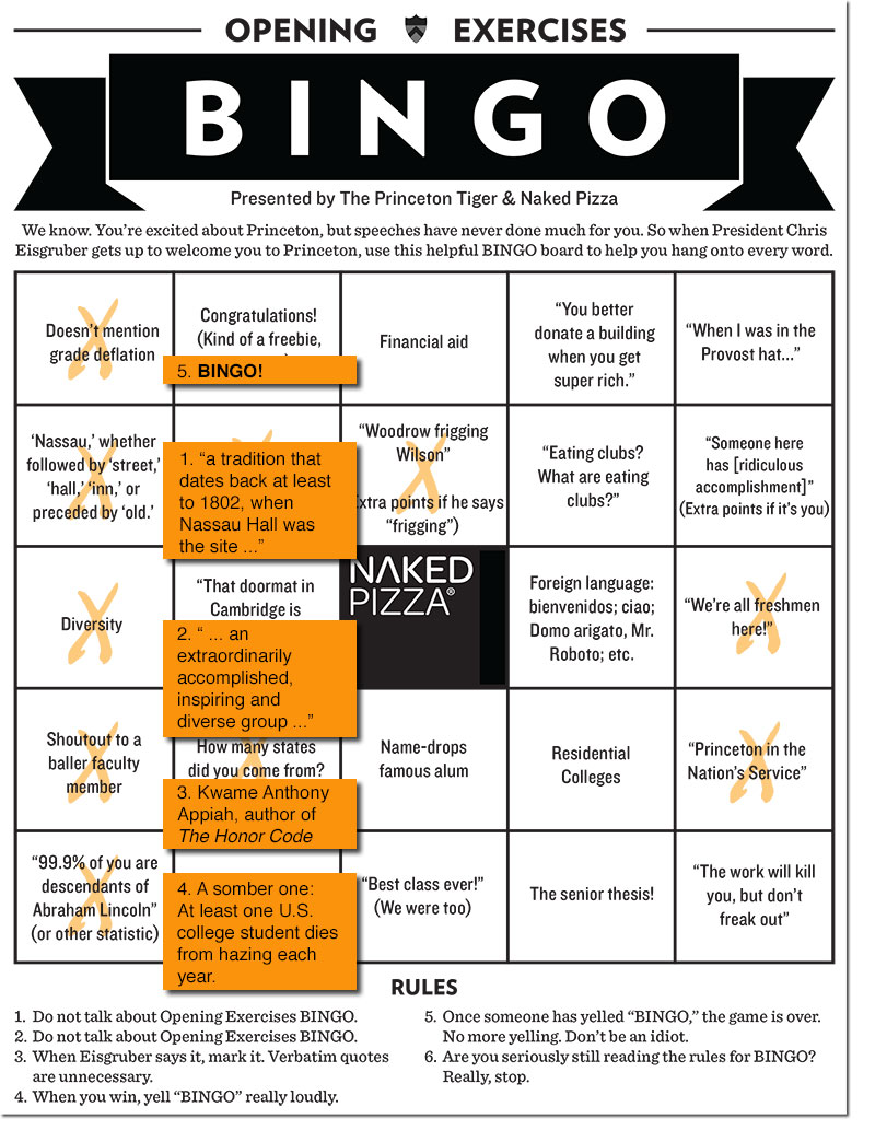 In his first address to the Class of 2017, President Eisgruber ’83 noted that some in the audience were hanging on his every word — in hopes of winning Opening Exercises Bingo. The Princeton Tiger handed out cards before the address, and PAW found a winning one, annotated below with words from Eisgruber’s address.