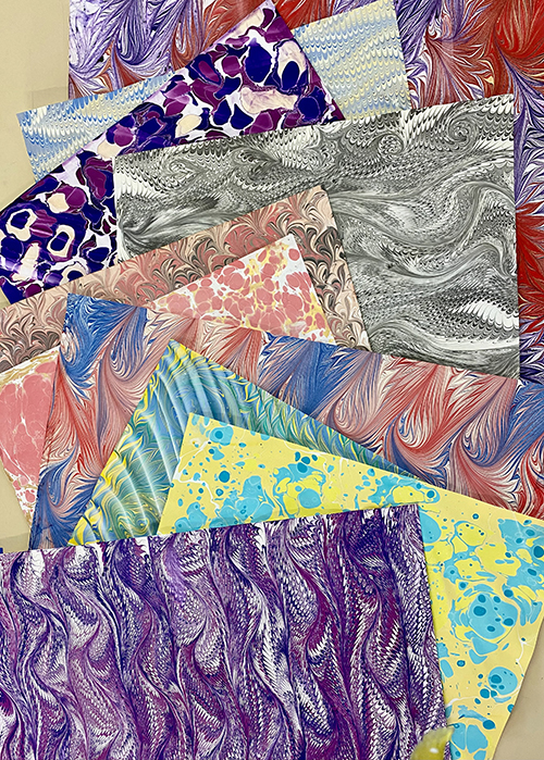 Deck gives a talk on the craft’s history, styles, and well-known artisans during his class. The patterns have names like Peacock, Cathedral, Scallop, Bouquet, and even New Jersey Ripple (invented by a Garden State artisan). The most basic pattern is called “stone” or “Turkish.” Marbling flourished for centuries in Turkey, and merchants brought it to Italy in the 16th century. But its origin is in China, it’s believed, and the craft spread to Japan in the 12th century, where it’s called suminagashi (“floating ink”), and Central Asia.