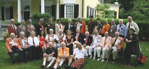 Class secretaries and memorialists gathered during Reunions weekend for PAW’s annual party in their honor. Pictured at Maclean House June 1 are, seated in front from left: Jay Siegel ’59, George Brakeley ’61, and Barry Bosak ’62; middle row: Bill Kelley ’40, Bob Carton ’42, Janet Grace w’44, Jen Adams ’01, Paul Sittenfeld ’69, Mark Swanson ’71, Class Notes editor Fran Hulette, Chester Files ’45, Warren Eginton ’45, Tom Meeker ’56, Charles Ganoe ’51, David Reeves ’48, and Erica Lehrer ’80; standing in back: Ralph DeGroff ’58, Tim Butts *72, James Barron ’77, Ed Strauss ’72, P.G. Sittenfeld ’07, Connie Buchanan ’78, Alan Mayers ’54, Mike Parish ’65, Raymond Hsu ’11, Zach Balin ’10, Sev Onyshkevych ’83, Eli Schwartz *60, Hugh Richardson ’53, and Jo Johnson ’64. Ed Essertier ’43 attended the event but missed the photo.
