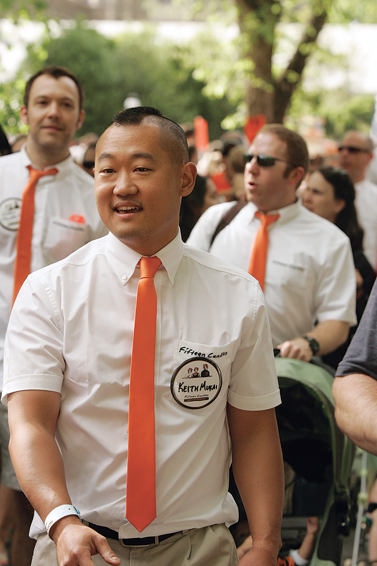Our outfits this year are based upon a 1984 Feelin’ Groovy fabric — large 1960s flowers on an orange background. Members of the Class of 1984 will be decked out in short-sleeved shirts and bucket hats made from this fabric, and our T-shirts will also bear the Feelin’ Groovy logo.