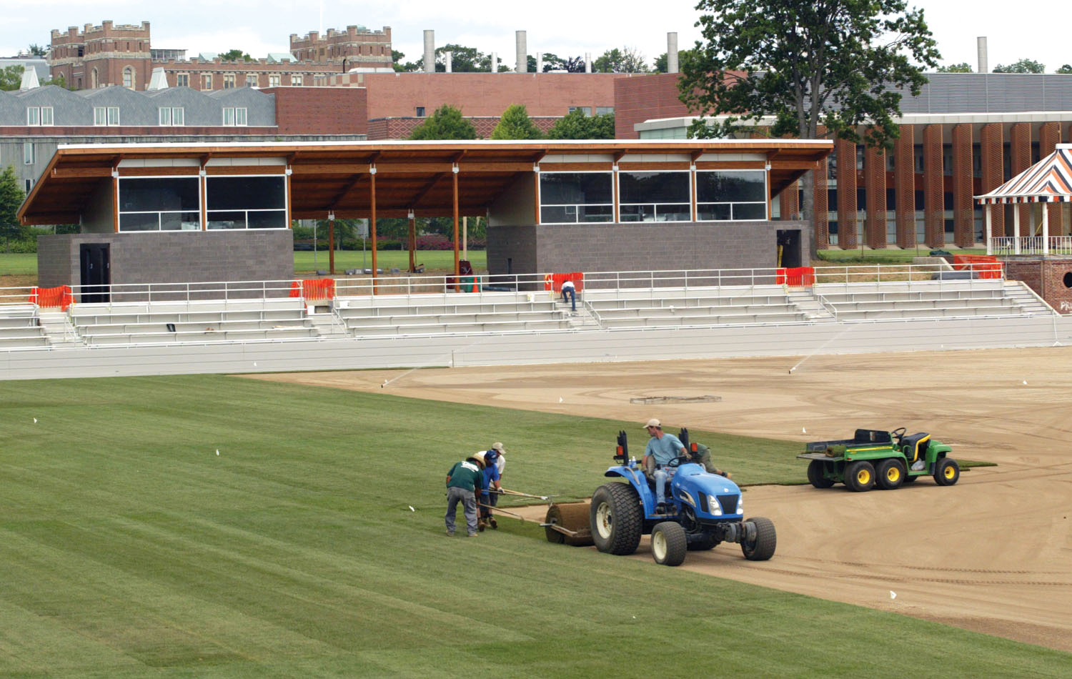 Myslik Field at Roberts Stadium, the new home of the Princeton men’s and women’s soccer teams, neared completion in June after workers laid sod for the game field. (The facility also will have an adjacent artificial-turf practice field.) The Tigers plan to open the stadium with a Sept. 5 doubleheader: The Princeton women will host Boston University at 5 p.m., and the men will play Lehigh at 7:30 p.m. A formal dedication will be held Oct. 4, when both teams take on Dartmouth to start the Ivy League season.