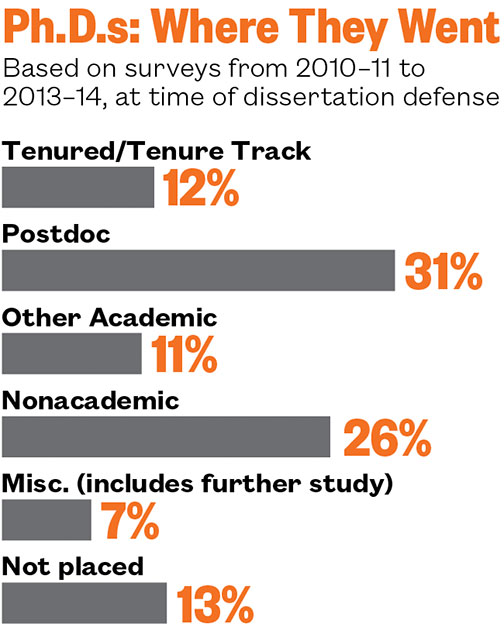 The Princeton surveys found that during the last four years, about one-fourth of Ph.D. recipients in the humanities and social sciences had a tenured or tenure-track position, while that figure was 5 percent or less for the natural sciences and engineering (adding in postdoc positions swells these numbers significantly). Nonacademic positions ranged from 7 percent for those in the humanities to 53 percent for engineers.