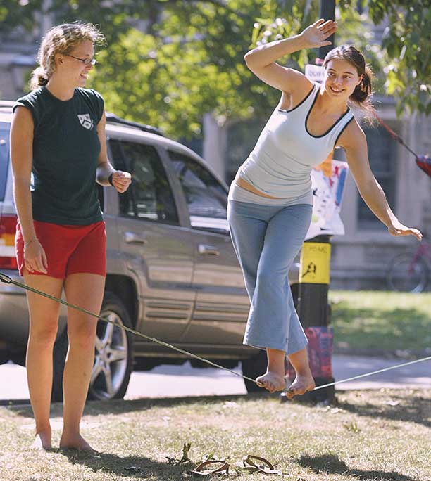 In September 2007 Hannah Grimm ’09 tested her balance walking a slackline between two trees near Blair Arch while friend Denali Barron ’09 looked on. What were some of your favorite outdoor activities while on campus? Let us know at paw@princeton.edu.