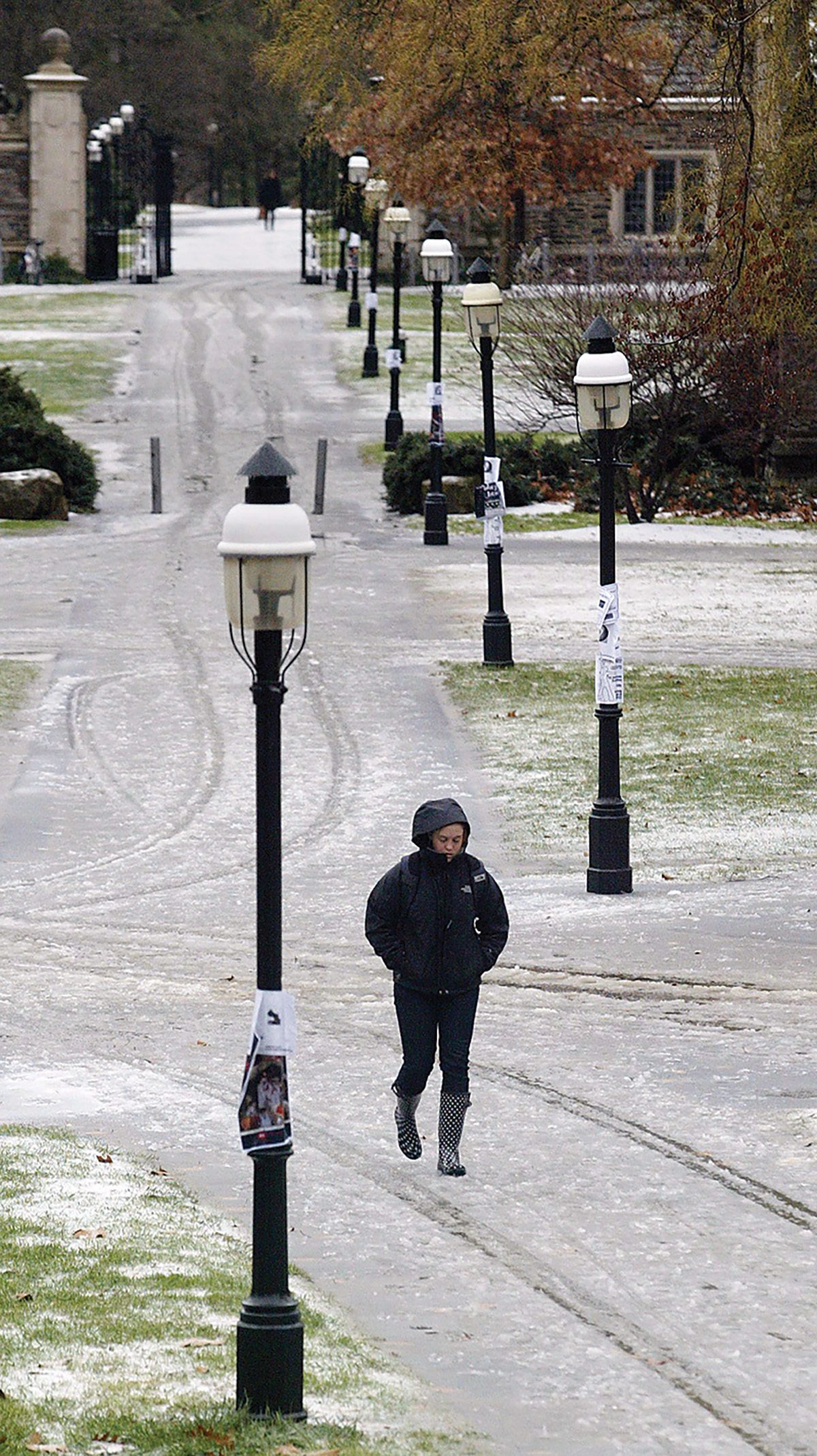 A student walks on the path leading towards Blair Arch on a December day in 2007. Let us know of a favorite winter event at Princeton or if you recognize the person in the photo at paw@princeton.edu.