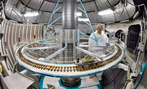 A toy train was circling the tracks at the Princeton Plasma Physics Lab for three days in early December, but it wasn’t a holiday display that technician “Sly” Vinson was watching. Inside the lab’s primary fusion-energy experiment, the National Spherical Torus Experiment, researchers used the train to carry a Californium-252 neutron source that simulated fusion neutrons emitted by plasmas. The goal was to calibrate the neutron rate during fusion experiments. “A model train may sound low-tech, but it provides us with exactly the right arrangement we need for this calibration,” said PPPL physicist Doug Darrow.