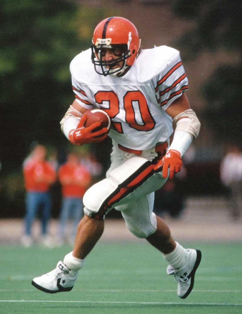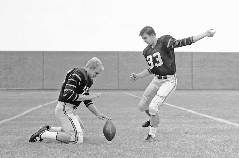 Caldwell, a three-sport athlete, returned to his alma mater to coach the Tigers in the post-World War II years. His teams reeled off 24 straight wins and 33 of 34 from the close of the 1949 season to the opening of the 1953 campaign. Caldwell compiled a sterling 70–30–3 record before Dick Colman, another maestro of the single-wing offense, took the helm in 1957, the year the Tigers won their first Ivy championship. They finished their perfect 1964 season ranked 13th nationally with All-Americans fullback Cosmo Iacavazzi ’65 *68 punishing defenders, linebacker Staś Maliszewski ’66 creating havoc, and soccer-style kicker Charlie Gogolak ’66 flummoxing opponents. Gogolak and big brother Pete, at Cornell, revolutionized the game by kicking with the instep instead of the toe, a skill they mastered as youths in Hungary before the family fled after the 1956 uprising. Charlie Gogolak kicked six field goals in a 1965 game against Rutgers and two weeks later a record 54-yarder against Cornell, which tried to stymie him with a human pyramid — two players stood on their teammates’ shoulders. The tactic was soon outlawed.