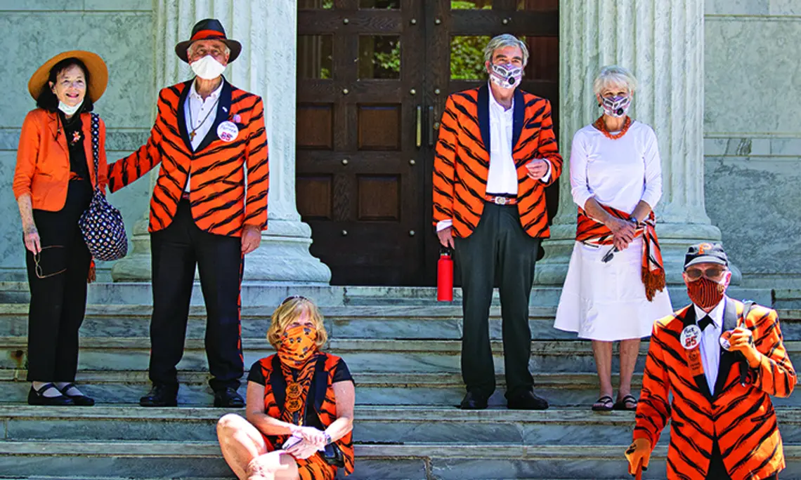 Some alumni might even have preferred a few of the virtual events. The Alumni Council meeting is normally held over lunch in a stifling Rockefeller Dining Hall for a capacity audience of about 200; this year, Chair Rich Holland ’96 presided with a Zoom backdrop of Rocky while more than 400 alumni “attended” in comfort. President Eisgruber ’83, wearing his black-and-orange-stripe class jacket, gave his traditional address from what looked like a home library.