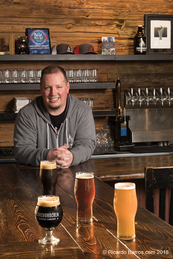 INTO THE DRINK: Ken Buonocore ’03 started with a beer-brewing kit and from there went on to build a micro-brewing empire. His preliminary recipes did well in home-brewing competitions when he started in 2010, and soon after his basement became a “mad-scientist lab” full of fridges, sacks of grain, and fermenters. In 2014 he started Conshohocken Brewing Co., which today distributes throughout Pennsylvania and New Jersey and has four taprooms in the Philadelphia area.
