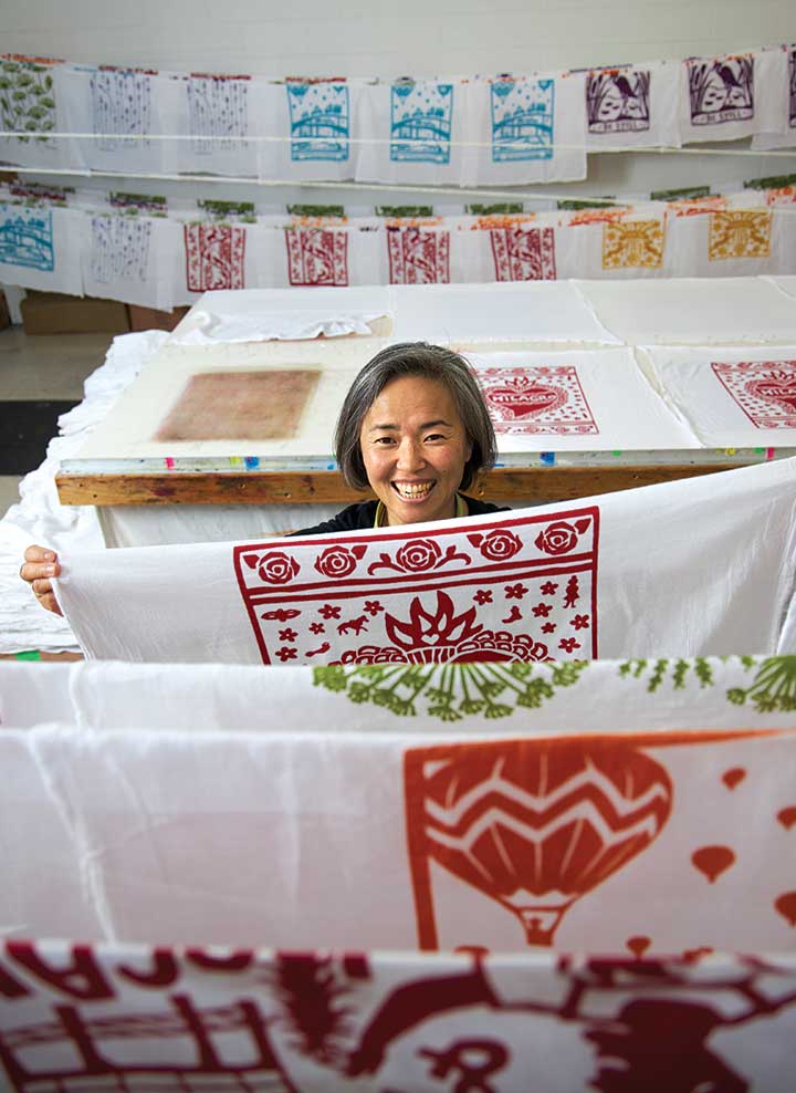 LASTING IMPRINTS: In 2010, Kei Tsuzuki ’90, pictured, and Molly Luethi opened Kei and Molly Textiles, which provides jobs and support for immigrant and refugee women in Albuquerque, N.M. Nine years later, the business is going strong, selling hand-printed towels and bags. Fewer refugees have resettled in New Mexico in recent years, but the company’s mission has not changed. “What it has given us an opportunity to do,” Tsuzuki says, “is really support the refugees who are already here.”
