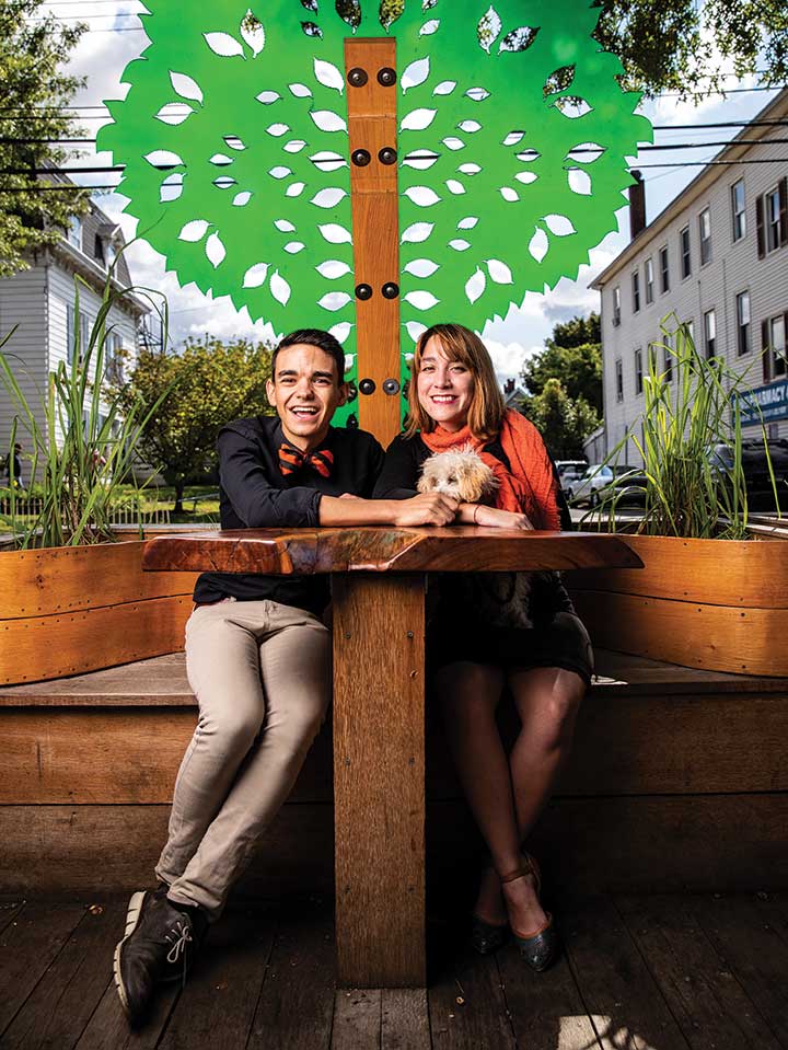 OUT OF THE WOODWORK: Misha Semenov ’15 and Kassandra Leiva ’15 (and their dog, Daphne), now architecture graduate students at Yale, appear inside their creation: an urban parklet. The modular structure, which was unveiled last summer and placed in the Fair Haven neighborhood in New Haven, Conn., offers seating, tables, and live foliage. The parklet is meant to inspire contemplation and connection with native ecology — a notion that Semenov and Leiva call ecoempathy. “If our buildings and cities connect us back to nature instead of separating us from it, we can begin to rebuild society based on symbiosis with other living systems,” says Semenov.