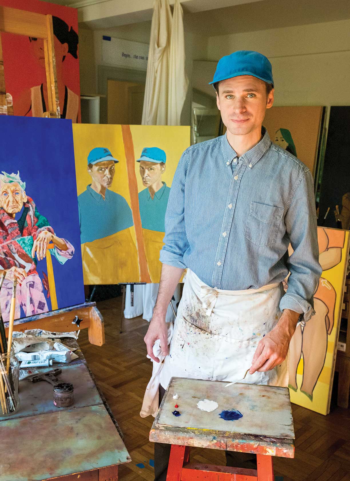 SELF EXPRESSION: Adam Dressner ’02 started teaching himself to paint after he graduated from law school and felt driven to do something creative. He had been writing fiction but fell into the trap of “editing and re-editing, forever.” Painting was different. “I couldn’t undo it. I could visually see my progress, which was very satisfying,” he says. He spent part of the pandemic lockdown living in upstate New York with his father and stepmother, exploring new styles, including a series of triptych portraits, and is now back in New York City. Since he quit his law-firm job in 2018, painting has been his main focus. “I treat it like a 9-to-5,” he says. “I wake up, have breakfast, and paint, five to six days a week.”