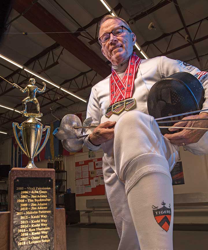 BY THE SWORD: Jim Adams ’61 arrived at Princeton a nonathlete, but the fencing team was recruiting: no experience necessary. By senior year, Adams had an array of medals and All-American recognition. Afterward, Adams continued to fence competitively, then took a 13-year “sabbatical” to raise his children. In 1995, he joined a national seniors team and is back at it: He is the only American to be national champ in all three weapons — foil, epee, and saber — and he’s done it twice, in 2010 and 2019. “I have countless friends in the fencing world,” he says. “That is my greatest reward.”