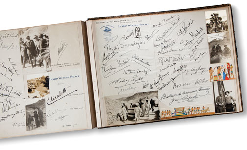 The public opening in March 1923 was attended by dignitaries who signed this album, owned by the American wife of British general John Grenfell Maxwell. Herbert’s autograph appears twice on the page, at upper right and halfway down on the left; Carnarvon’s at upper left – complete with hieroglyphic.