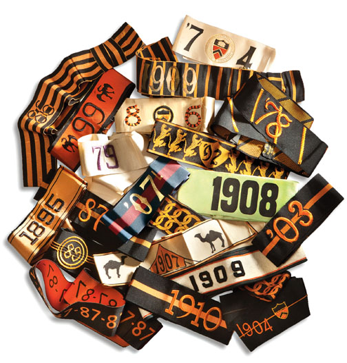 What: As campus fashion grew tony and buttoned-down in the 1890s, the zany hats of earlier years (including black caps with 2-foot-long pointed orange brims) gave way to more austere styles — brightened with hatbands. These colorful grosgrain silk ribbons, inscribed with class numerals, were blazons of status. Lowly freshmen weren’t allowed to wear them.