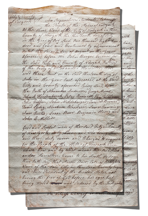 The coroner’s inquest, shown here, survives, charging Vice President Burr with murder: He was “moved and seduced by the Instigation of the devil” to kill his rival.