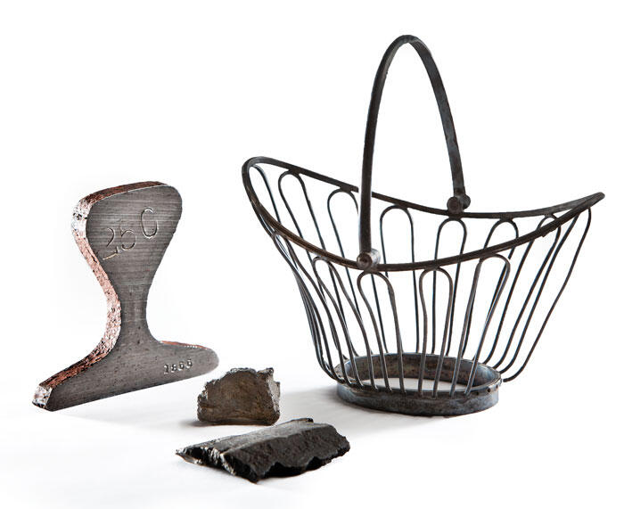 A section of one of the beams is pictured here, along with two fragments of the college bell and a rescued sugar basket.