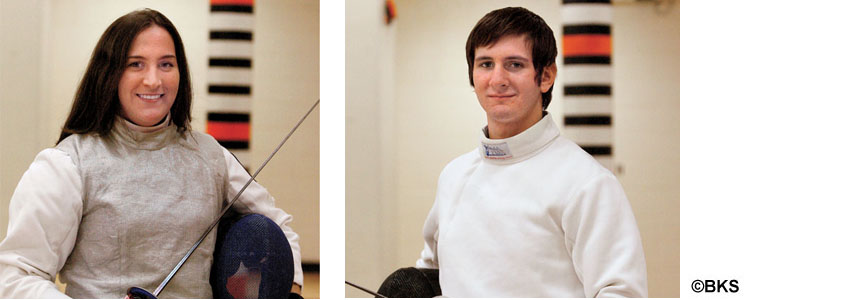Andrea Oliva ’12, above left, won the decisive bout as WOMEN’S FENCING edged Harvard 14–13 Feb. 28 to complete a perfect 6–0 Ivy season and its first league championship since 2001. Standouts included Susannah Scanlan ’12 (epee), Brianna Martin ’13 (foil), and Eliza Stone ’13 (sabre).